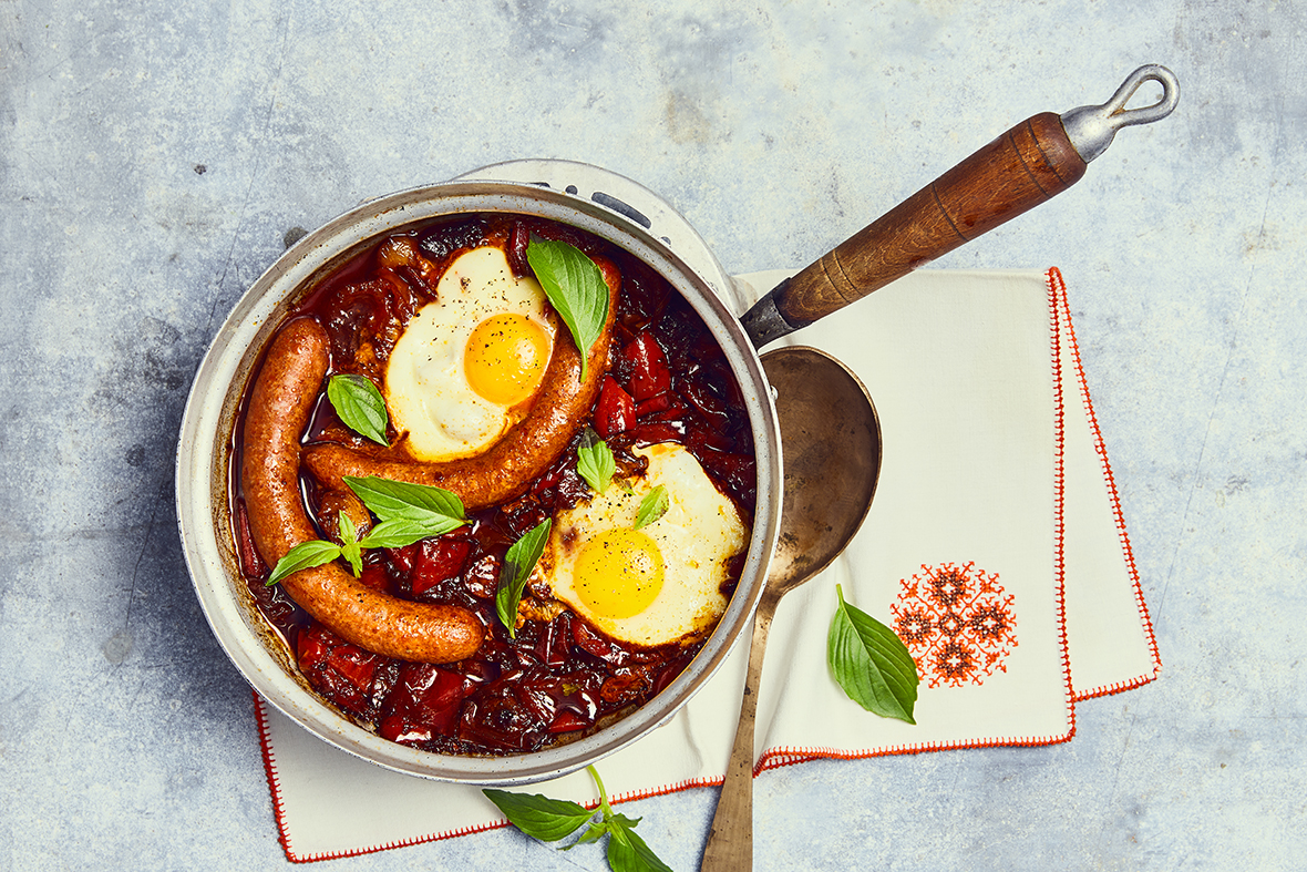 Es un poco como un pisto pero menos flotante, con vegetales rojos que se cocinan durante mucho, mucho tiempo a fuego lento, se arrugan y se vuelven casi confitados. Añádale algunas salchichas hechas por un buen carnicero o elaborador artesanal (pueden ser con o sin picante, o más tipo chorizo), unos huevos rotos por encima y seguro que la vuelta al cole te parecerá más agradable.