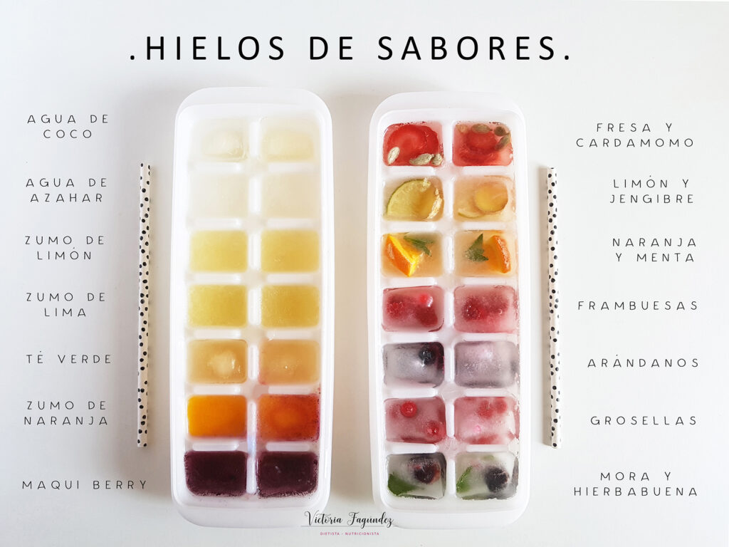 - Hielos: Las opciones a la hora de crear hielos saborizantes son ilimiatadas. Añádelos tal cual o pícalos si quieres una textura tipo granizado.