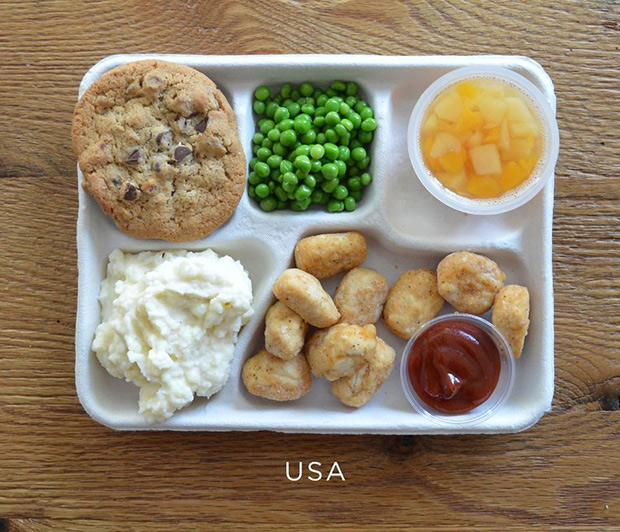 Cualquiera que conozca los principios básicos de una alimentación sana se llevará las manos a la cabeza al ver el menú elegido como ejemplo de los comedores estadounidenses. Se trata de pollo frito (quizás los populares nuggets), guisantes y puré de patata que parecen salidos de un congelador. Fruta envasada en almíbar y una galleta industrial de chocolate. Ni tan siquiera la salsa se salva del delito contra la alimentación sana.