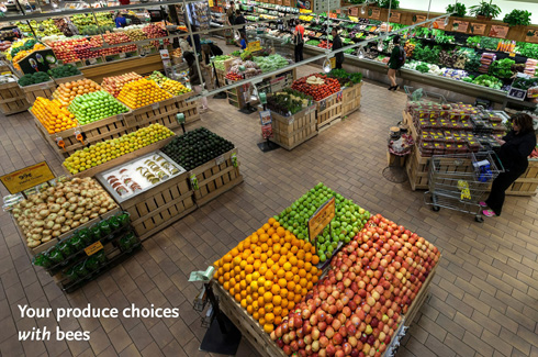 Empezamos por compartir 2 fotos publicadas en el supermercado Whole Foods market store, templo del consumo orgánico y local en Estados Unidos. Arriba, puestos de hoy; abajo, los de mañana si las abejas desaparecieran. «Las abejas polinizan más de 100 cultivos en los Estados Unidos, desde las almendras en la granola hasta los arándanos en el yogur», explican los ejecutivos de Whole Foods. “El declive de las abejas amenaza muchos de los ingredientes frescos que anhelan los consumidores«.