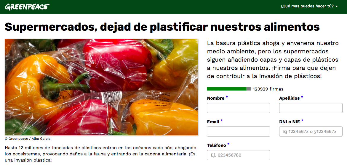 Ya hemos conseguido más de 120.000 firmas en nuestra petición para eliminar el sobre envasado de frutas y verduras en supermercados. Esta petición (no más plástico en nuestra comida) estará abierta hasta finales de año con la intención de recoger el mayor número posible de firmas y mostrar a los supermercados el movimiento social que se ha creado, consciente de la problemática que presentan los plásticos de un solo uso. Junto con el apoyo de la ciudadanía, seguiremos dialogando con supermercados con el objetivo de que lleguen a ser más sostenibles y nos ayuden a construir el camino hacia mares y océanos libres de plásticos.