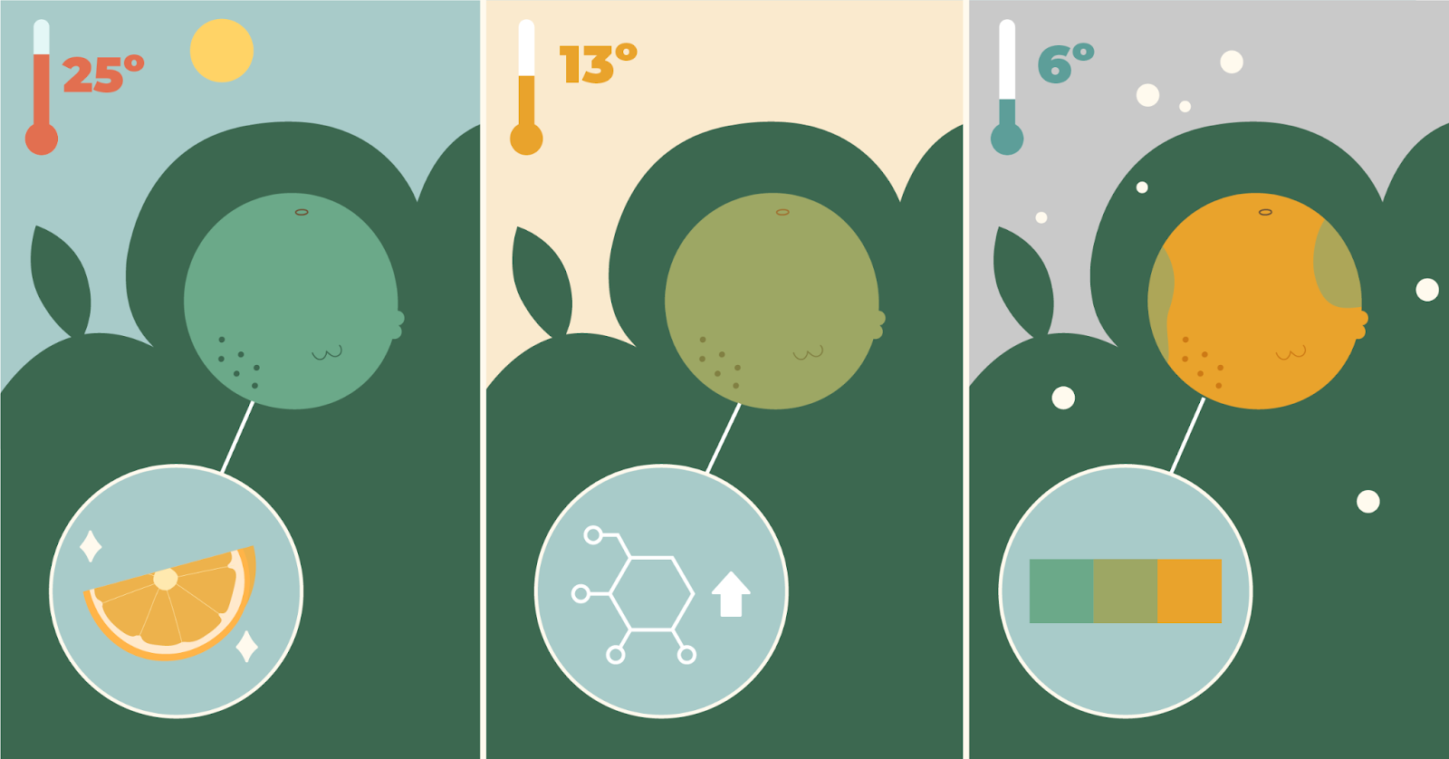 - Les basses températures de l’hiver, inférieures à 13 degrés pendant la journée, provoquent le changement de couleur des oranges et la fin de leur maturation.