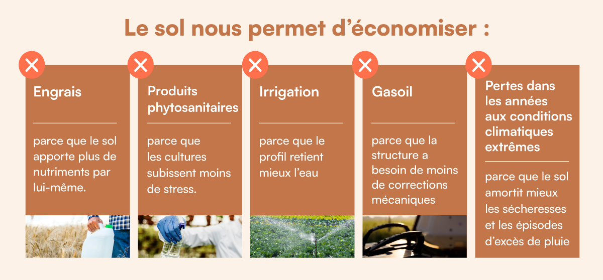 • Une plus grande résilience = moins de pertes : environ 360 €/ha/an en réduisant la variabilité des rendements lorsque le sol se comporte comme un sol de haute qualité.
