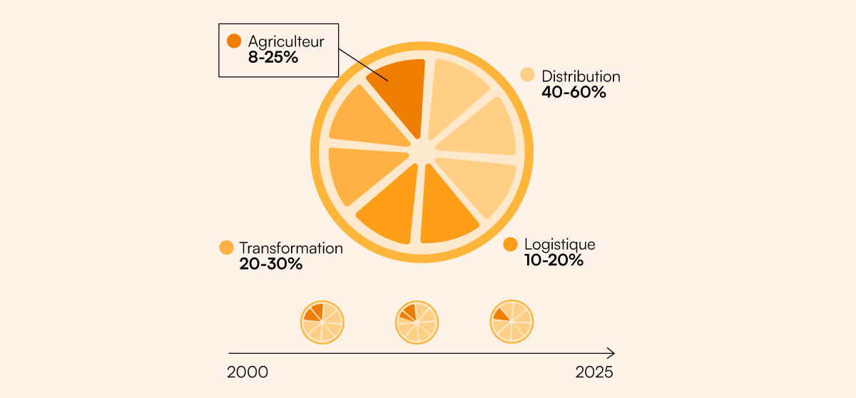 Dans la plupart des chaînes alimentaires européennes, la part du prix final qui revient à l’agriculteur est faible — entre 8 % et 25 % — et elle a diminué au fil du temps. La distribution capte souvent entre 40 % et 60 % de la valeur. (OCDE & FAO, 2023 ; Heinrich Böll Stiftung, 2025).