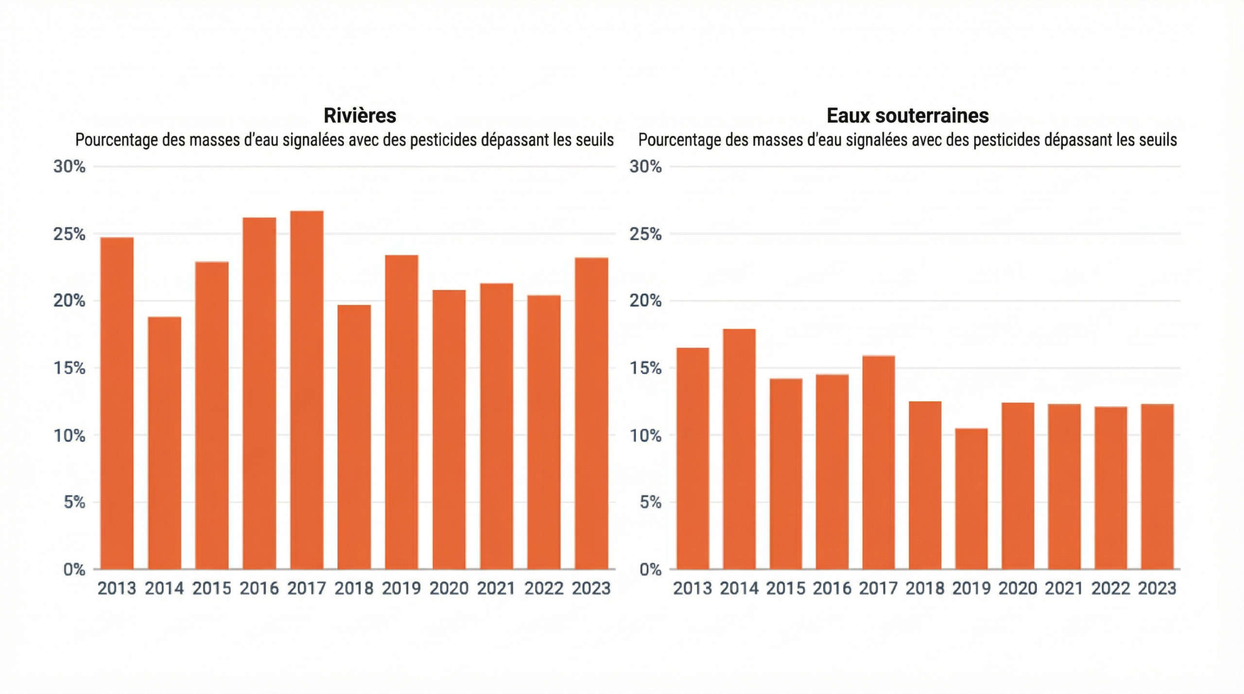 Les données de surveillance à travers l’Europe montrent à quel point cette dérive est devenue généralisée. Selon l’Agence européenne pour l’environnement, entre 19 % et 27 % des rivières européennes contiennent des concentrations de pesticides supérieures aux seuils de sécurité écologique. Les eaux souterraines s’en sortent à peine mieux, avec 11 % à 18 % des masses d’eau surveillées dépassant les limites de sécurité. Pour une ressource qui fournit une grande partie de l’eau potable en Europe, ce n’est pas une marge négligeable.